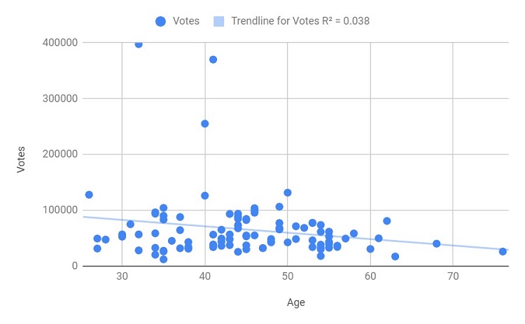 Faktor terakhir yang tak kalah penting dalam mempengaruhi keterpilihan caleg perempuan di pemilu adalah usia. Data menunjukkan bahwa rerata usia caleg terpilih perempuan adalah 44,64, yang lebih muda jika dibandingkan rerata laki-laki, yaitu 49,72 tahun. Pada pemilu tahun 2014, setiap tambahan tahun dalam usia menurunkan peluang menang sekitar 3,2 persen. Grafik di bawah menunjukkan pola keterkaitan antara usia dan jumlah suara yang diraup oleh caleg perempuan terpilih. Korelasi ini menunjukkan bahwa caleg yang lebih muda cenderung mendulang lebih banyak suara daripada mereka yang lebih tua, di mana tiga caleg berusia di bawah 45 tahun sukses meraup lebih dari 200.000 suara.